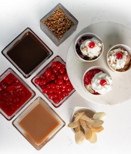 - Plenty of the following toppings - Chocolate, butterscotch, strawberry, whipped cream, pecans, and cherries