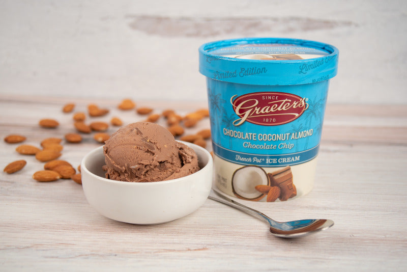 Indulge in our Chocolate Almond Chocolate Chip ice cream, blending rich chocolate ice cream with grated coconut, crisp almonds, and gourmet milk chocolate chips—a taste of warmer days in every bite.